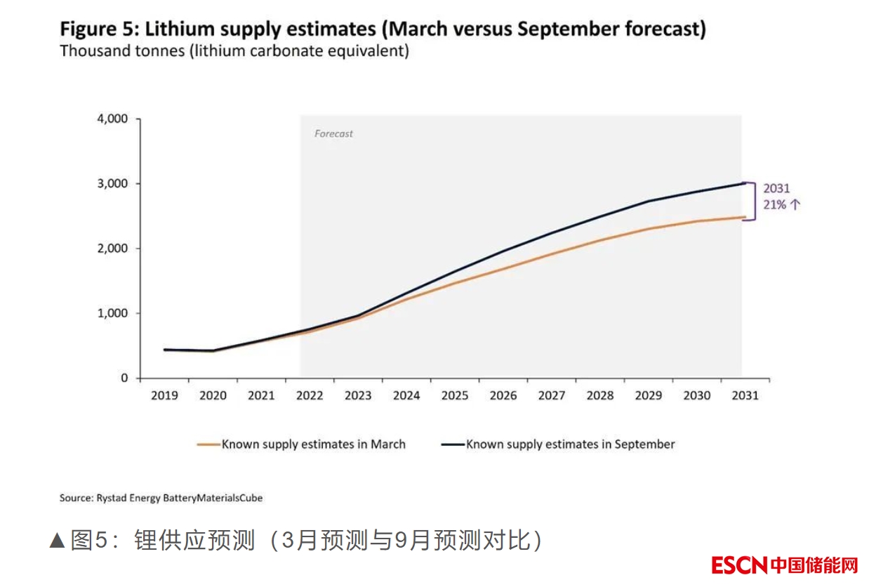 早在今年3月,睿咨得能源就預(yù)測,到2030年,鋰礦物的估計(jì)總產(chǎn)量將略低于250萬噸LCE。今年9月,睿咨得能源最新預(yù)計(jì),到2030年鋰礦物的總產(chǎn)量將達(dá)到300萬噸LCE。隨著更多的項(xiàng)目從最初的勘探轉(zhuǎn)向了實(shí)質(zhì)性的勘探,產(chǎn)量也隨之增長。在睿咨得能源最新預(yù)測中,2031年的鋰礦已知總供應(yīng)量比2031年3月的供應(yīng)量高21%,因?yàn)樵谶^去6個月里已宣布增加和加速勘探進(jìn)展的項(xiàng)目的預(yù)計(jì)產(chǎn)能和產(chǎn)量不斷更新(見圖5)。