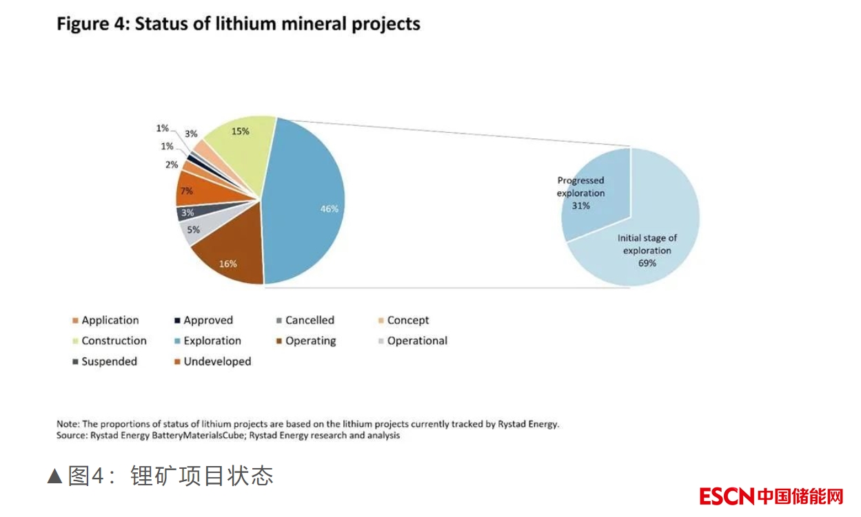 截至今年10月中旬,在睿咨得能源跟蹤的238個鋰項(xiàng)目,僅16%左右正式投產(chǎn),近50%仍在勘探中。在勘探項(xiàng)目中,約70%仍處于初步勘探階段,這意味著在2031年之前,這些項(xiàng)目可能的增量還沒有被統(tǒng)計(jì)到估計(jì)的已知總供應(yīng)量中(見圖4)。而這些項(xiàng)目的勘探和開發(fā)可能會加快,并且在未來10年中補(bǔ)充到總的供應(yīng)量中。