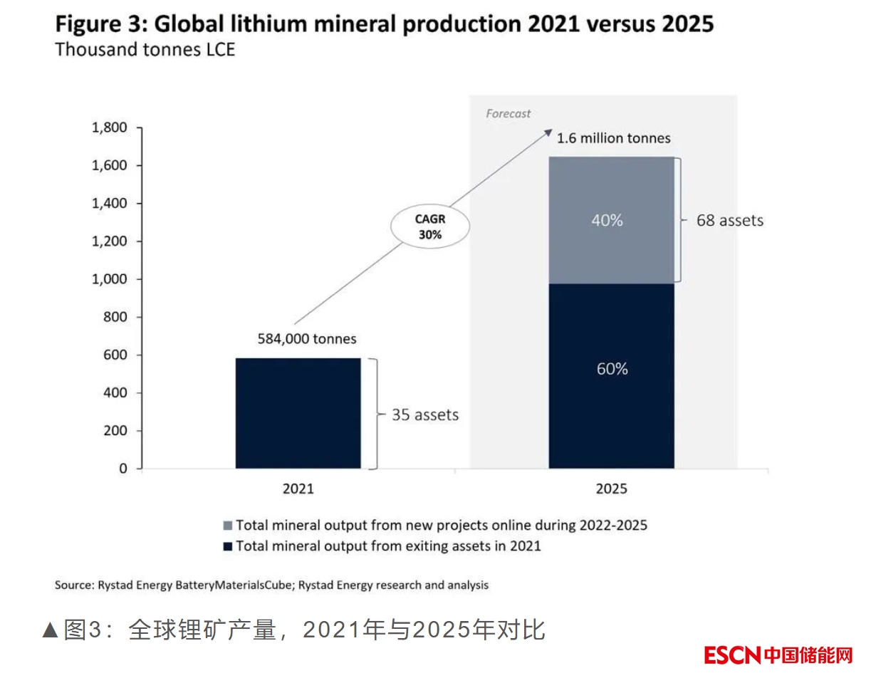與其他電池礦物(鈷和鎳)相比,鋰礦中處在勘探狀態(tài)的項(xiàng)目遠(yuǎn)遠(yuǎn)多于在產(chǎn)項(xiàng)目,鋰資源具有較大潛力。睿咨得能源預(yù)測,到2021年,35個在產(chǎn)鋰礦項(xiàng)目總產(chǎn)量約為58.5萬噸LCE(碳酸鋰當(dāng)量),到2025年,或?qū)?03個在產(chǎn)項(xiàng)目,總產(chǎn)量可能增至165萬噸LCE,這其中包括將在2022至2025年開始投產(chǎn)的68個項(xiàng)目,預(yù)計(jì)將占到2025年鋰礦總產(chǎn)量的40%(見圖3)。