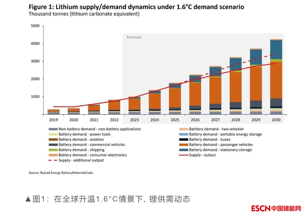 睿咨得能源(Rystad Energy)今年10月重新對鋰供需平衡進(jìn)行了預(yù)測。通過模擬全球升溫1.6°C和1.8°C兩種情況,睿咨得能源預(yù)計(jì),2022年的鋰短缺或是2025年之前最嚴(yán)重的一年,預(yù)計(jì)全年鋰礦物的供應(yīng)將比總需求少10%(見圖1)。根據(jù)對過去幾個月的全球電動汽車銷量分析,睿咨得能源估計(jì)目前的電池需求軌跡更接近1.6°C情景下的需求。