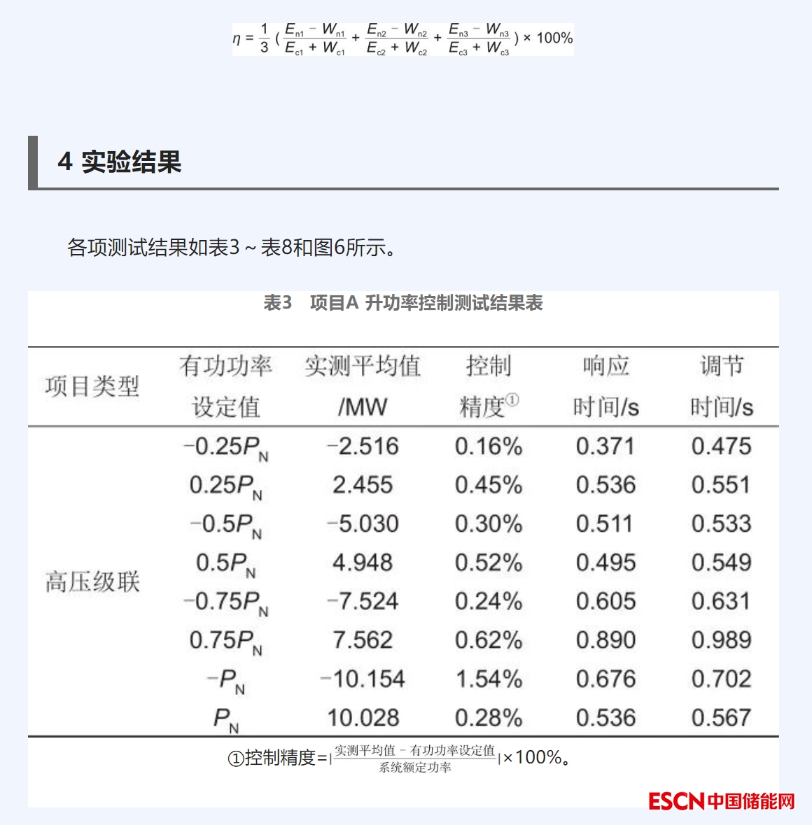 (2)在額定功率充放電條件下,記錄儲(chǔ)能系統(tǒng)收到控制信號(hào)的時(shí)刻t3,記錄儲(chǔ)能充/放電功率的偏差維持在額定功率±2%以內(nèi)的起始時(shí)刻,記為t4,t4減去t3即為充/放電調(diào)節(jié)時(shí)間ATc,重復(fù)3次,充/放電調(diào)節(jié)時(shí)間取3次結(jié)果中的最大值。
