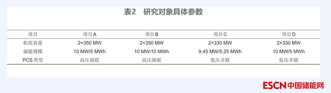 綜上所述,在火儲(chǔ)聯(lián)合調(diào)頻項(xiàng)目中,儲(chǔ)能系統(tǒng)的功率控制、充放電響應(yīng)時(shí)間以及能量轉(zhuǎn)換效率性能是衡量火儲(chǔ)聯(lián)調(diào)項(xiàng)目?jī)?chǔ)能系統(tǒng)集成效果的重要技術(shù)性指標(biāo)。考慮到試驗(yàn)樣本的一致性,以廣東省內(nèi)火電機(jī)組容量相近、儲(chǔ)能規(guī)模類似的4個(gè)火儲(chǔ)聯(lián)合調(diào)頻項(xiàng)目作為研究對(duì)象(項(xiàng)目具體參數(shù)見表2),通過設(shè)計(jì)試驗(yàn)方案對(duì)火儲(chǔ)聯(lián)合調(diào)頻項(xiàng)目中低壓并聯(lián)和高壓級(jí)聯(lián)的儲(chǔ)能系統(tǒng)進(jìn)行有功和無功功率控制、充放電響應(yīng)性能以及能量轉(zhuǎn)換效率對(duì)比分析,研究不同拓?fù)浣Y(jié)構(gòu)的儲(chǔ)能系統(tǒng)并網(wǎng)性能。
