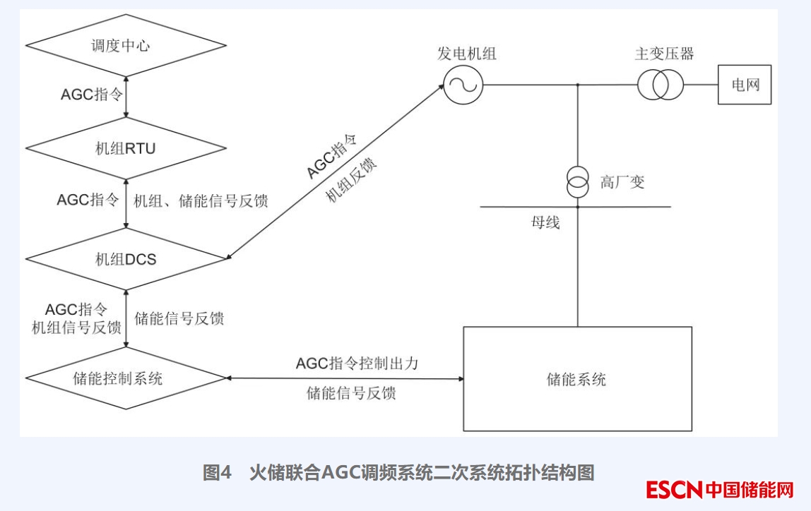 在機(jī)組投入AGC模式下,調(diào)度向機(jī)組遠(yuǎn)程終端單元(remote terminal unit,RTU)發(fā)送AGC調(diào)頻指令,RTU接收指令后,迅速將信號(hào)傳遞至機(jī)組分散控制系統(tǒng)(distributed control system,DCS),DCS控制機(jī)組向目標(biāo)值出力,同時(shí)將信號(hào)傳送至儲(chǔ)能控制系統(tǒng)。儲(chǔ)能控制系統(tǒng)根據(jù)調(diào)頻機(jī)組實(shí)時(shí)負(fù)荷與AGC指令目標(biāo)負(fù)荷之間的差值,控制儲(chǔ)能單元出力大小彌補(bǔ)差值,并向RTU和DCS反饋相應(yīng)信號(hào),RTU接收儲(chǔ)能和機(jī)組的反饋信號(hào)后,整合機(jī)組和儲(chǔ)能的出力情況并向相關(guān)數(shù)據(jù)上送調(diào)度,完成一個(gè)調(diào)頻周期?;饍?chǔ)聯(lián)合調(diào)頻系統(tǒng)的控制邏輯拓?fù)浣Y(jié)構(gòu)圖如圖4所示。