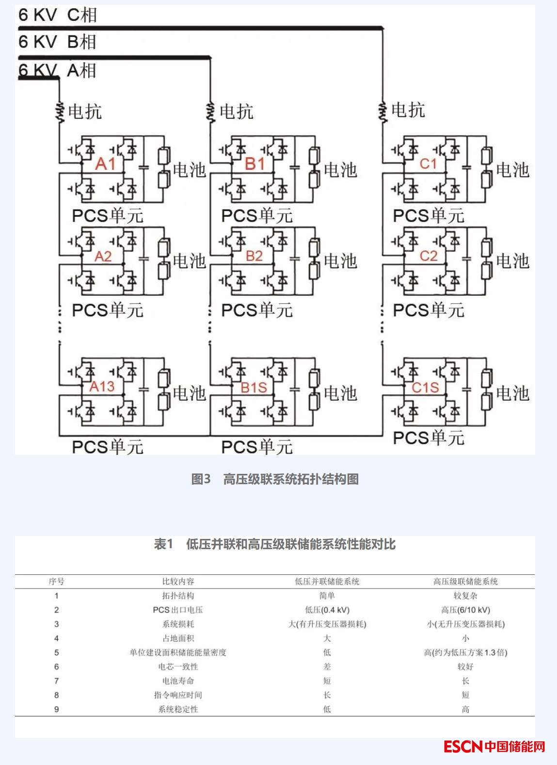 在高壓級(jí)聯(lián)儲(chǔ)能單元中,級(jí)聯(lián)儲(chǔ)能PCS的每個(gè)H橋單元由一個(gè)電池組和與之并聯(lián)的濾波電容及H橋逆變電路組成,輸出相電壓電平m=2N+1(N為功率變換單元數(shù)),輸出線電壓為4N+1電平;隨著功率變換單元的增加,會(huì)使得并網(wǎng)電流波形更加平滑。多個(gè)H橋單元交流側(cè)串聯(lián)作為級(jí)聯(lián)儲(chǔ)能PCS的一相,三相采用星形接線方式。相較于低壓并聯(lián),高壓級(jí)聯(lián)系統(tǒng)拓?fù)浣Y(jié)構(gòu)較為復(fù)雜,如圖3所示。低壓并聯(lián)和高壓級(jí)聯(lián)儲(chǔ)能系統(tǒng)性能對(duì)比如表1所示,高壓級(jí)聯(lián)儲(chǔ)能系統(tǒng)能夠直接輸出6 kV/10 kV,無需經(jīng)過變壓器,不僅減小系統(tǒng)損耗,提高效率,還減少了儲(chǔ)能系統(tǒng)的占地面積,降低了土地建設(shè)施工成本,提高了單位建設(shè)面積的能量密度。此外,在這種拓?fù)浣Y(jié)構(gòu)下,儲(chǔ)能系統(tǒng)能夠最大限度地減少或消除電池簇的并聯(lián)情況,使得各個(gè)電池簇之間相互獨(dú)立,減少或消除電池單體和電池簇的環(huán)流現(xiàn)象,削弱了儲(chǔ)能系統(tǒng)中電池一致性導(dǎo)致的問題,提高電池系統(tǒng)的循環(huán)壽命、降低了生產(chǎn)運(yùn)行的安全風(fēng)險(xiǎn)。高壓級(jí)聯(lián)儲(chǔ)能系統(tǒng)每三相為一組控制單元,儲(chǔ)能系統(tǒng)不需要根據(jù)并聯(lián)儲(chǔ)能單元性能的差異進(jìn)行協(xié)調(diào)后再響應(yīng)指令,縮短了儲(chǔ)能系統(tǒng)的響應(yīng)時(shí)間。高壓級(jí)聯(lián)的拓?fù)浣Y(jié)構(gòu)在低壓直流側(cè)可以減少開關(guān)損耗,進(jìn)一步提高系統(tǒng)效率;而且低壓側(cè)的電子元件所需電流及高壓側(cè)的電力元件所需耐壓等級(jí)均明顯降低,有利于提高系統(tǒng)的穩(wěn)定性。