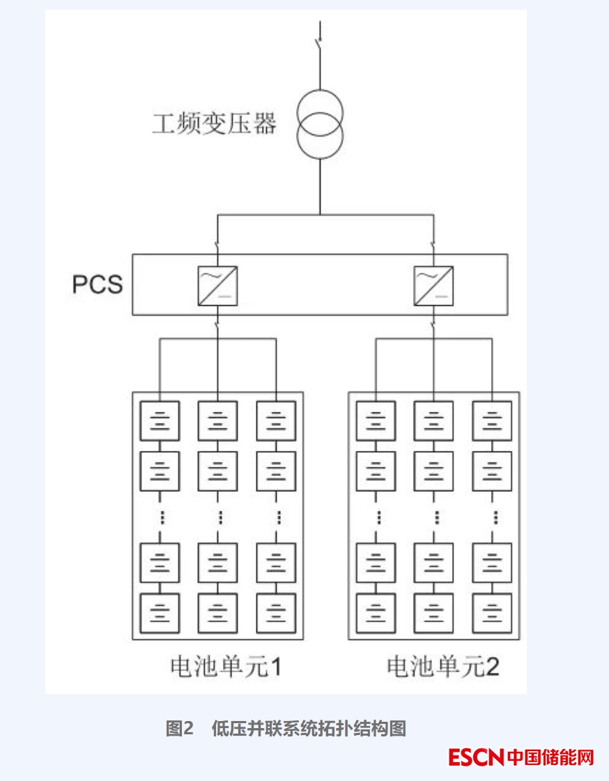 目前,廣東地區(qū)火儲(chǔ)聯(lián)合調(diào)頻的低壓并聯(lián)儲(chǔ)能系統(tǒng)采用的都是單級(jí)式的PCS拓?fù)浣Y(jié)構(gòu),具體拓?fù)浣Y(jié)構(gòu)如圖2所示。儲(chǔ)能電池直接連接到DC/AC變換器的直流側(cè),再通過升壓變壓器轉(zhuǎn)成高壓輸入電網(wǎng)。這種拓?fù)浣Y(jié)構(gòu)簡(jiǎn)單,DC/AC變換器損耗小,易于控制。但是該結(jié)構(gòu)不利于儲(chǔ)能單元容量的擴(kuò)大。盡管通過并聯(lián)足夠多的電池簇可以增加儲(chǔ)能系統(tǒng)的容量,但在使用過程中,由于電池單體存在一致性、充放電電流、運(yùn)行環(huán)境等差異,在長(zhǎng)期使用的過程中會(huì)導(dǎo)致儲(chǔ)能系統(tǒng)不一致性愈發(fā)凸顯,進(jìn)而導(dǎo)致電池壽命縮短、儲(chǔ)能系統(tǒng)可放電能量下降等問題。加上直流側(cè)電池的電壓限制,交流側(cè)出口電壓一般在400 V左右,目前新的1500 V PCS盡管能夠支持直流側(cè)電壓升至1500 V,相應(yīng)的交流側(cè)電壓在700 V左右,但仍需要經(jīng)過升壓變壓器才能接入中高壓電網(wǎng),而并聯(lián)多臺(tái)升壓變壓器會(huì)進(jìn)一步增加系統(tǒng)的損耗以及整個(gè)儲(chǔ)能電站設(shè)備的成本與占地面積。因此,通過并聯(lián)多個(gè)變壓器隔離的儲(chǔ)能單元來擴(kuò)大儲(chǔ)能系統(tǒng)的容量也會(huì)造成系統(tǒng)效率低下及穩(wěn)定性問題。除此之外,由于并聯(lián)多個(gè)儲(chǔ)能系統(tǒng),并聯(lián)的多組PCS之間的相互協(xié)調(diào)會(huì)占用部分系統(tǒng)資源,并聯(lián)的PCS越多,系統(tǒng)的響應(yīng)時(shí)間越長(zhǎng)。