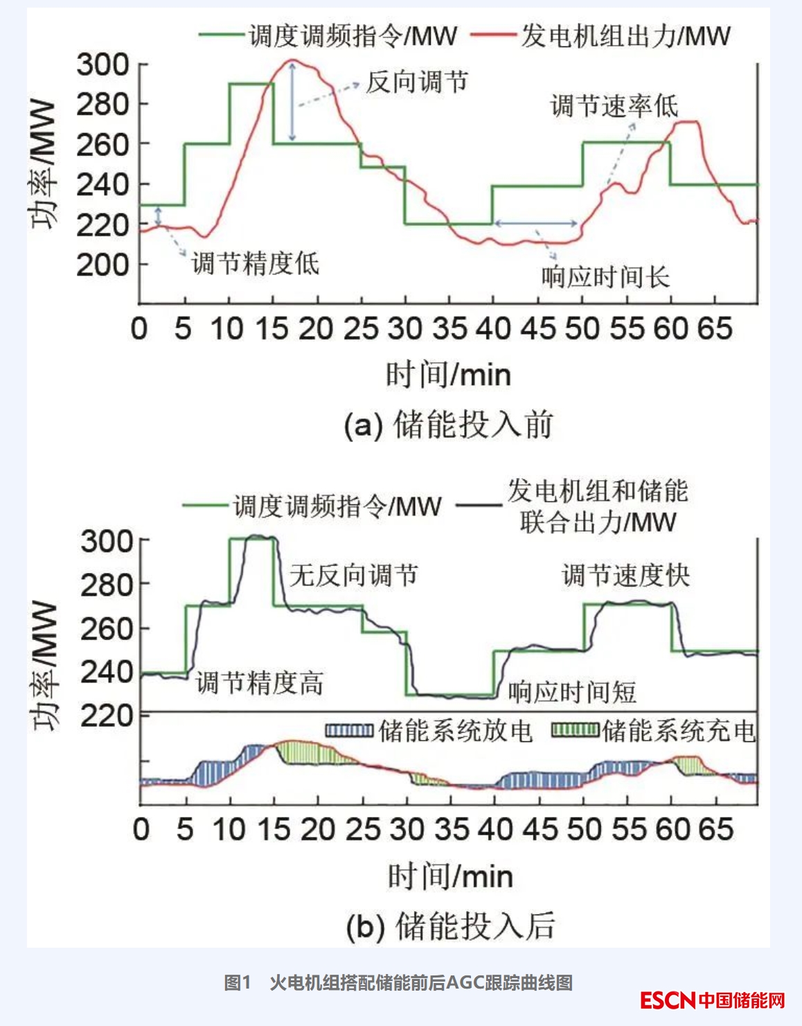 “雙碳”目標(biāo)下,由于能源的生產(chǎn)、消費(fèi)和利用呈現(xiàn)新的發(fā)展趨勢(shì),在此趨勢(shì)下電力系統(tǒng)的電源結(jié)構(gòu)、負(fù)荷特性、電網(wǎng)形態(tài)、技術(shù)基礎(chǔ)及運(yùn)行特性將發(fā)生深刻變化,構(gòu)建新型電力系統(tǒng)將面臨電力電量平衡、系統(tǒng)安全穩(wěn)定、新能源高效利用等挑戰(zhàn)。由于新能源發(fā)電具有波動(dòng)性及不確定性,會(huì)影響電網(wǎng)運(yùn)行的穩(wěn)定性,為了保障電網(wǎng)安全穩(wěn)定運(yùn)行,電力系統(tǒng)需要更多的靈活調(diào)頻資源來提升自身調(diào)節(jié)能力?;痣姍C(jī)組作為我國(guó)重要的發(fā)電載體承擔(dān)著主要的調(diào)頻工作。火電機(jī)組的自動(dòng)發(fā)電控制(automatic generation control,AGC)響應(yīng)時(shí)間長(zhǎng)、功率爬坡速度慢、穩(wěn)態(tài)精度低,無法滿足當(dāng)前的調(diào)頻需求。電化學(xué)儲(chǔ)能系統(tǒng)具有調(diào)節(jié)速率快、響應(yīng)時(shí)間短、調(diào)節(jié)精度高等優(yōu)點(diǎn),屬于優(yōu)質(zhì)的調(diào)頻資源,能夠有效彌補(bǔ)火電機(jī)組調(diào)頻性能的不足。圖1為某火電廠增加電池儲(chǔ)能系統(tǒng)前后AGC跟蹤曲線,增加儲(chǔ)能系統(tǒng)后,火電機(jī)組能有效提高發(fā)電單元的調(diào)節(jié)速率、縮短響應(yīng)時(shí)間、提高調(diào)節(jié)精度,提升綜合調(diào)頻性能,配合電力調(diào)度機(jī)構(gòu)改善電網(wǎng)的頻率波動(dòng),緩解電網(wǎng)調(diào)頻資源特別是優(yōu)質(zhì)調(diào)頻資源不足的問題。為了進(jìn)一步加強(qiáng)電化學(xué)儲(chǔ)能電站安全管理,國(guó)家能源局發(fā)布了《關(guān)于加強(qiáng)電化學(xué)儲(chǔ)能電站安全管理的通知》,由于電化學(xué)儲(chǔ)能系統(tǒng)并網(wǎng)后,其功率調(diào)節(jié)響應(yīng)、充放電的規(guī)律和保護(hù)功能等都會(huì)對(duì)機(jī)組和廠用電設(shè)備的可靠運(yùn)行產(chǎn)生影響。此外許多儲(chǔ)能項(xiàng)目還存在簡(jiǎn)單的堆砌現(xiàn)象,導(dǎo)致許多儲(chǔ)能輔助調(diào)頻項(xiàng)目存在能量效率不高、綜合調(diào)頻性能提升不明顯等問題。因此,為了保障儲(chǔ)能系統(tǒng)、機(jī)組及廠用電負(fù)荷的安全運(yùn)行,降低生產(chǎn)運(yùn)行風(fēng)險(xiǎn),電化學(xué)儲(chǔ)能調(diào)頻系統(tǒng)在并網(wǎng)前開展規(guī)范全面的并網(wǎng)檢測(cè)具有重要意義。
