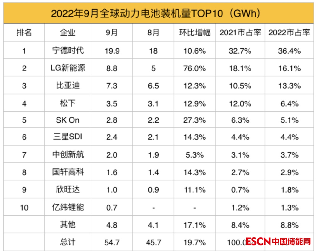 韓國(guó)市場(chǎng)研究機(jī)構(gòu)SNE Research數(shù)據(jù)顯示,9月全球動(dòng)力電池裝機(jī)量54.7GWh,環(huán)比上漲19.7%,同比增長(zhǎng)超1.6倍。