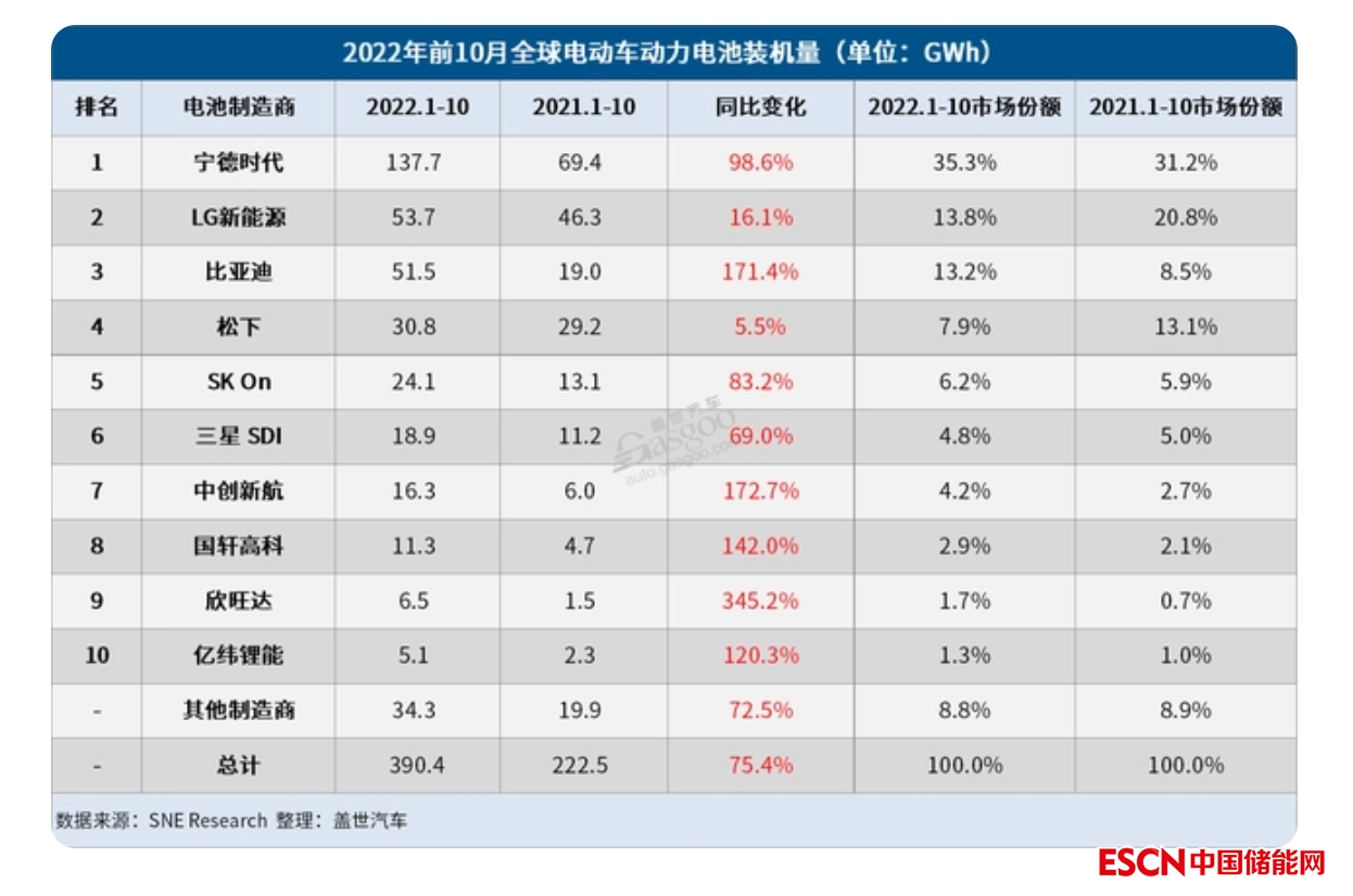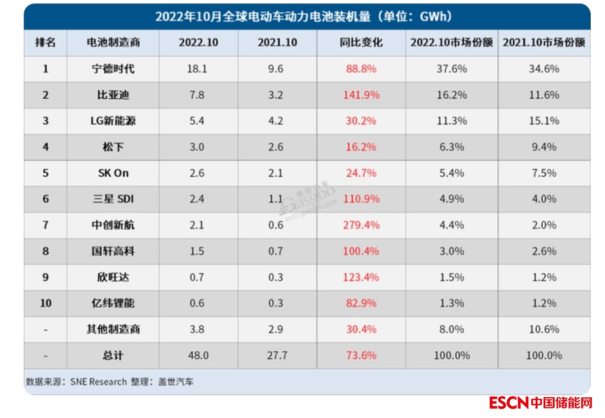 中國儲能網訊:12月2日,韓國市場研究機構SNE Research公布的數(shù)據(jù)顯示,2022年10月,全球電動汽車電池裝機量達到48 GWh,同比增長73.6%,連續(xù)28個月保持穩(wěn)定增長。在2021年創(chuàng)下“五連冠”的記錄后,寧德時代自年初以來已連續(xù)10個月在榜單中強勢領跑。比亞迪也不甘落后,一直與LG新能源角逐第二名,裝機量再創(chuàng)月度新高,并在榜單中再度奪得亞軍。