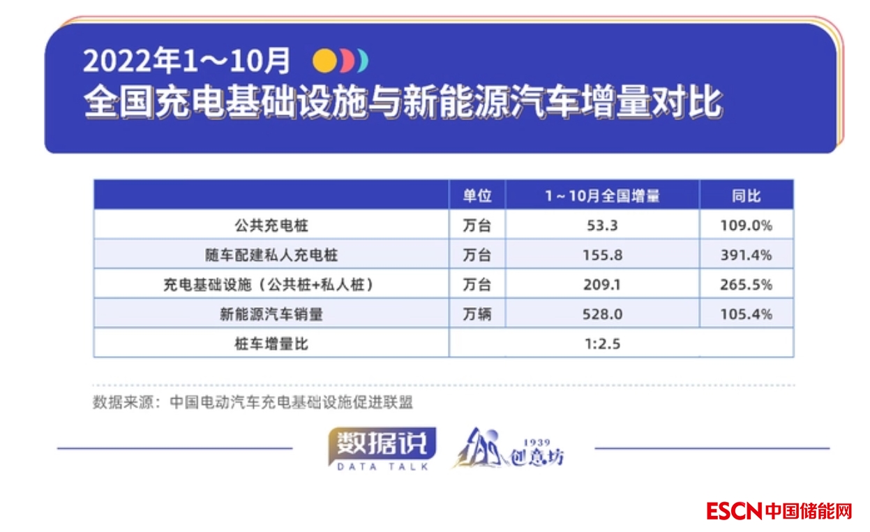 中國電動汽車充電基礎設施促進聯(lián)盟(簡稱中國充電聯(lián)盟)的數(shù)據(jù)顯示,2022年1~10月,充電基礎設施增量為209.1萬臺,新能源汽車銷量528.0萬輛,充電基礎設施與新能源汽車繼續(xù)爆發(fā)式增長。樁車增量比為1:2.5,充電基礎設施建設能夠基本滿足新能源汽車的快速發(fā)展。