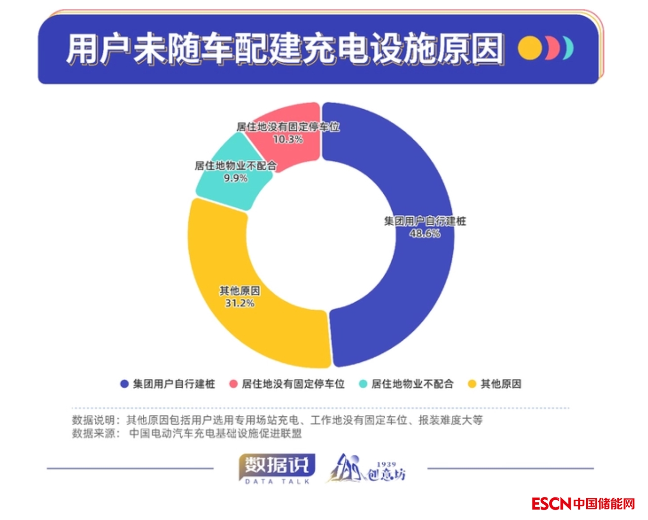 截至2021年底,中國充電聯(lián)盟采樣了38.1萬條未隨車配建充電設施原因數(shù)據(jù)。其中集團用戶自行建樁、居住地沒有固定停車位、居住地物業(yè)不配合這三個因素是未隨車配建充電設施的主要原因,占比分別為48.6%、10.3%、9.9%,合計68.8%。