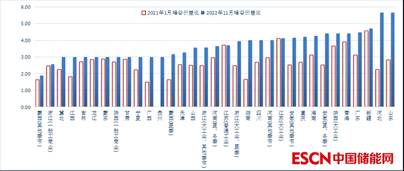 高峰電價與低谷電價的比值普遍超過3倍,近一半統(tǒng)計結果接近或超過4倍,其中山東與河北南網的峰谷價差比更達到5.67倍,明顯超過其他地區(qū)。與2021年1月時各地峰谷價差相比,除江蘇未調整高峰、低谷電價外,其他地區(qū)峰谷價差比都有所加大。