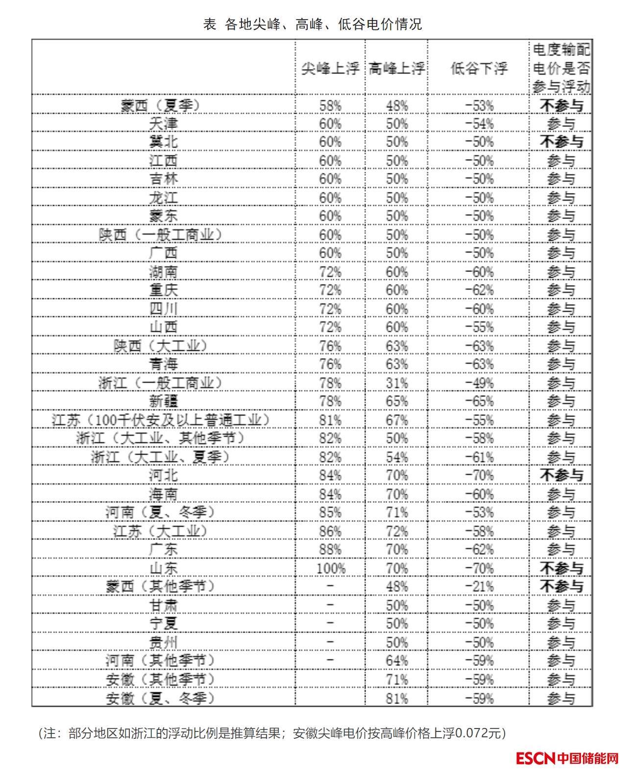 26個地區(qū)中,高峰電價上浮比例普遍達到或超過50%,其中安徽上浮比例最高,夏、冬季達到81%;蒙西在夏季以外的季節(jié)低谷電價下浮比例最小僅為21%,山東、河北南網兩地低谷電價下浮則達到70%;除蒙西夏季價格外,其他地區(qū)尖峰電價較平段上浮均達到或超過60%,其中山東尖峰電價更高達100%。值得注意的是,冀北、河北南網、山東、蒙西四地的浮動比例,是按照電度輸配電價不參與浮動計算得到的。另外,山東深谷電價是在平價基礎上下浮90%,并且山東對容量補償電價也執(zhí)行分時。