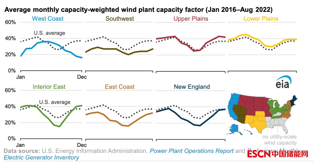 中國儲能網訊:據美國能源信息署的數(shù)據,在全美范圍內,2016年1月至2022年8月期間,風電場容量因子均在在3月和4月達到峰值,在7月和8月達到最低值。發(fā)電廠的性能通常以給定時間段內最大可能發(fā)電量的百分比來表征,這是一種稱為容量因數(shù)的度量。