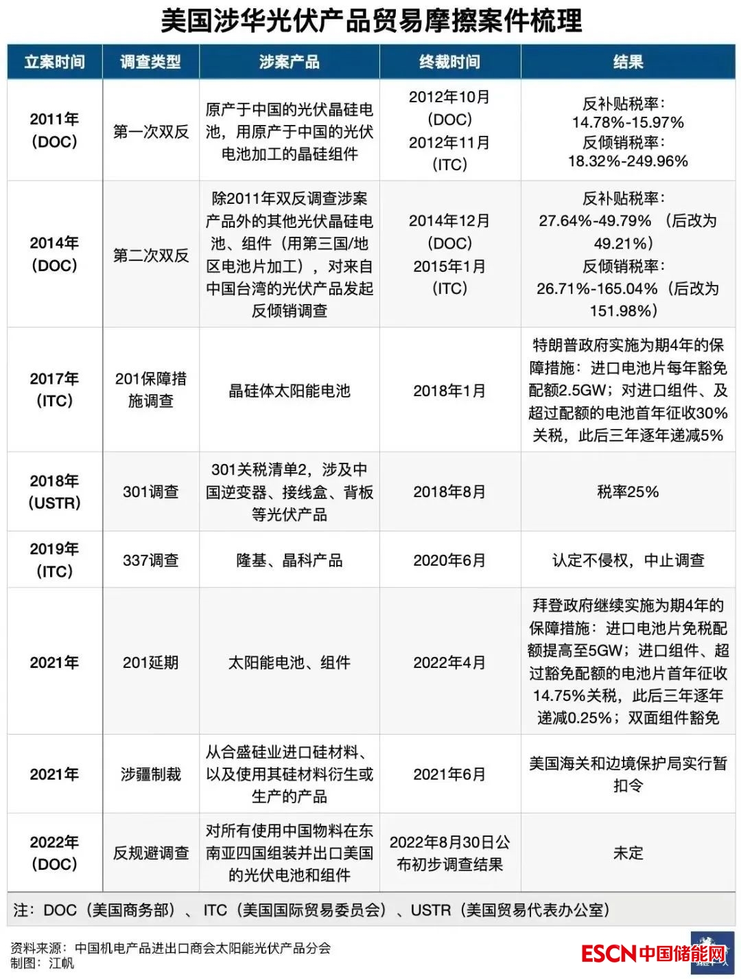 2022年以來(lái),美國(guó)對(duì)華光伏貿(mào)易政策密集。2月,美國(guó)將即將到期的光伏電池與組件210關(guān)稅延長(zhǎng)4年;3月,美國(guó)對(duì)東南亞四國(guó)的光伏產(chǎn)品發(fā)起反規(guī)避調(diào)查;6月, 拜登豁免未來(lái)2年內(nèi)從東南亞四國(guó)進(jìn)口的光伏產(chǎn)品關(guān)稅,以保障美國(guó)光伏項(xiàng)目進(jìn)度。