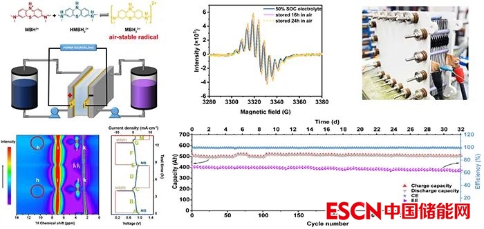 本工作中,團(tuán)隊(duì)通過(guò)研究電解液中的不同組分間的相互作用,實(shí)現(xiàn)了電解液組分優(yōu)化,大幅度提高了電池容量。團(tuán)隊(duì)通過(guò)電化學(xué)—原位核磁共振技術(shù)發(fā)現(xiàn),MB分子在電池運(yùn)行時(shí)會(huì)發(fā)生歸中反應(yīng)生成自由基態(tài);電子自旋共振技術(shù)和理論計(jì)算結(jié)果表明,自由基態(tài)和還原態(tài)在空氣中的穩(wěn)定是該分子電化學(xué)反應(yīng)高度可逆和結(jié)構(gòu)穩(wěn)定的重要原因。為了進(jìn)一步驗(yàn)證MB分子在有機(jī)液流電池中應(yīng)用的可行性,團(tuán)隊(duì)組裝了10節(jié)1000cm2的有機(jī)液流電池電堆,電堆的瞬時(shí)放電功率超過(guò)了1kW,并連續(xù)運(yùn)行32天,容量幾乎沒(méi)有衰減。此外,團(tuán)隊(duì)還對(duì)MB電解液在高溫70℃進(jìn)行了加速壽命衰減測(cè)試,并分析了其可能的衰減機(jī)理。該項(xiàng)研究不僅闡釋了有機(jī)活性分子的耐氧化機(jī)理,為分子的設(shè)計(jì)提供重要參考;而且開發(fā)的千瓦級(jí)電堆有望為水系有機(jī)液流電池從實(shí)驗(yàn)室走向?qū)嵱没峁┝己玫慕梃b。