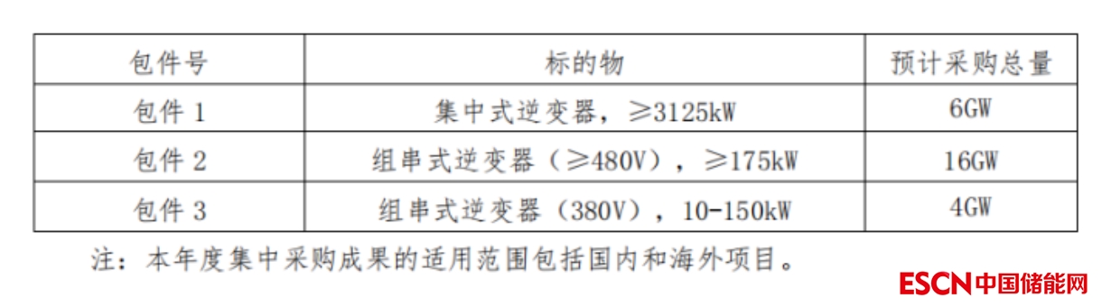 逆變器:分為3個(gè)包件進(jìn)行投標(biāo),其中包括6GW集中式逆變器,≥3125kW;16GW組串式逆變器(≥480V),≥175kW;4GW組串式逆變器(380V),10-150kW。潛在投標(biāo)人可以對某一包件或全部包件進(jìn)行投標(biāo),各包件組成詳見下表: