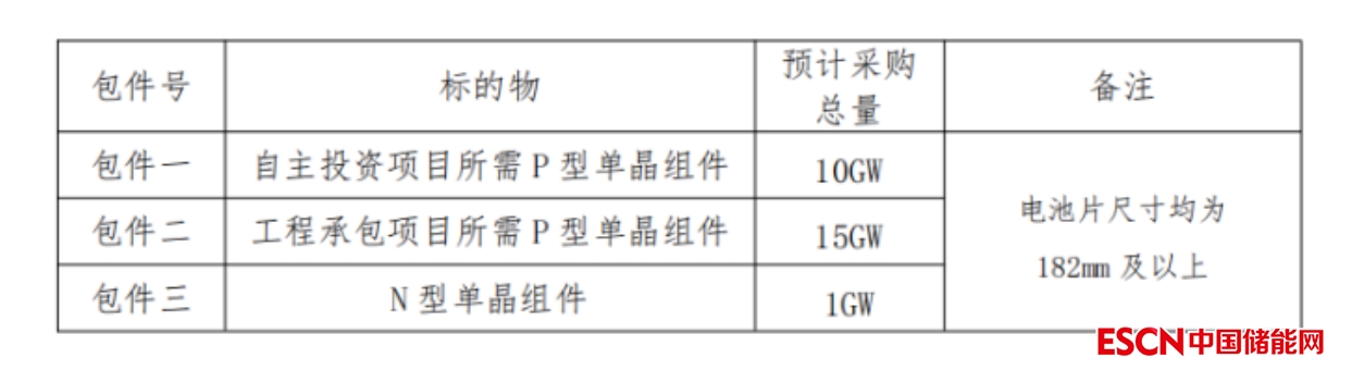 組件方面:本次招標(biāo)分為3個(gè)包件進(jìn)行投標(biāo),其中包括自主投資項(xiàng)目所需P型單晶組件10GW、工程承包項(xiàng)目所需P型組件15GW、以及N型單晶組件1GW。電池片尺寸均要求182mm及以上。潛在投標(biāo)人可以對某一包件或全部包件進(jìn)行投標(biāo),各包件組成詳見下表: