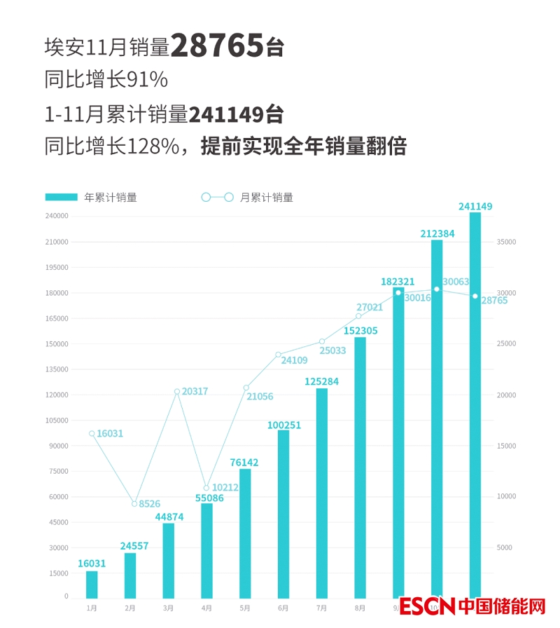 毫無(wú)疑問(wèn),埃安目前正值高速發(fā)展階段,埃安11月份銷量28765輛,同比增長(zhǎng)91%,今年1-11月份累計(jì)銷量241149輛,同比增長(zhǎng)128%,提前實(shí)現(xiàn)全年銷量翻倍。按照埃安年初設(shè)定的“保20萬(wàn)輛,挑戰(zhàn)25萬(wàn)輛”銷量目標(biāo),這一目標(biāo)已經(jīng)基本可以看作:已完成。