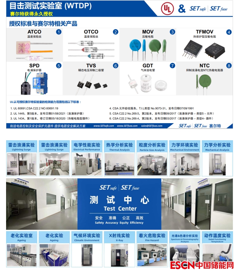 賽爾特取得美國UL認可目擊測試實驗室(WTDP)(UL 1449、UL 1434、UL 60691)、德國TUV萊茵授權實驗室資質(IEC/EN 60691、IEC/EN 61051-1、IEC/EN 61051-2、IEC/EN 62368-1、IEC/EN 61643-11、IEC/EN 61643-21、IEC/EN 61643-31、IEC/EN 62319-1、IEC/EN 62319-1-1、IEC/EN 60539-1)。超過1000多項的專業(yè)的測試、實驗設備,多個設備是業(yè)界最好的品牌。