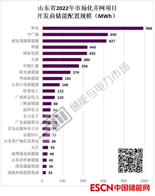 從開(kāi)發(fā)商看,共24個(gè)新能源開(kāi)發(fā)企業(yè)參與了54個(gè)項(xiàng)目的競(jìng)配。其中,華電集團(tuán)配儲(chǔ)規(guī)模最大,為495MW/988MWh;中廣核、招遠(yuǎn)龍?jiān)葱履茉囱b機(jī)規(guī)模也超過(guò)600MWh。此外,山東項(xiàng)目也不乏陽(yáng)光新能源、天合、晶科電力、特變電工等光伏企業(yè)的身影。