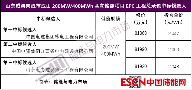 中國(guó)儲(chǔ)能網(wǎng)訊:近日,山東威海榮成市成山200MW/400MWh共享儲(chǔ)能項(xiàng)目EPC工程總承包中標(biāo)候選人對(duì)外發(fā)布。中國(guó)電建集團(tuán)核電工程有限公司以總報(bào)價(jià)81868萬(wàn)元,折合單價(jià)2.047元/Wh,成為第一中標(biāo)候選人。