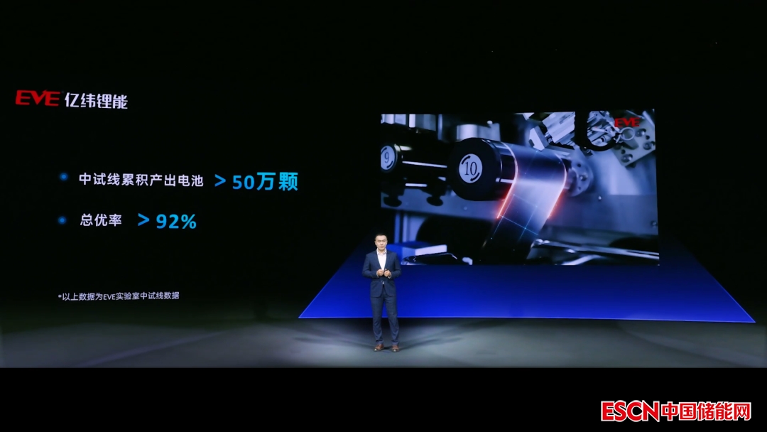 動力電池研究院圓柱電池研究所所長徐悅斌,發(fā)布新一代大圓柱電池的研發(fā)樣品:能量密度350Wh/kg,可實現(xiàn)9分鐘超快充。在電池性能再創(chuàng)新高的同時,由億緯鋰能自主研發(fā)的大圓柱中試線,已累計制樣超50萬顆,整體優(yōu)率達到92%。