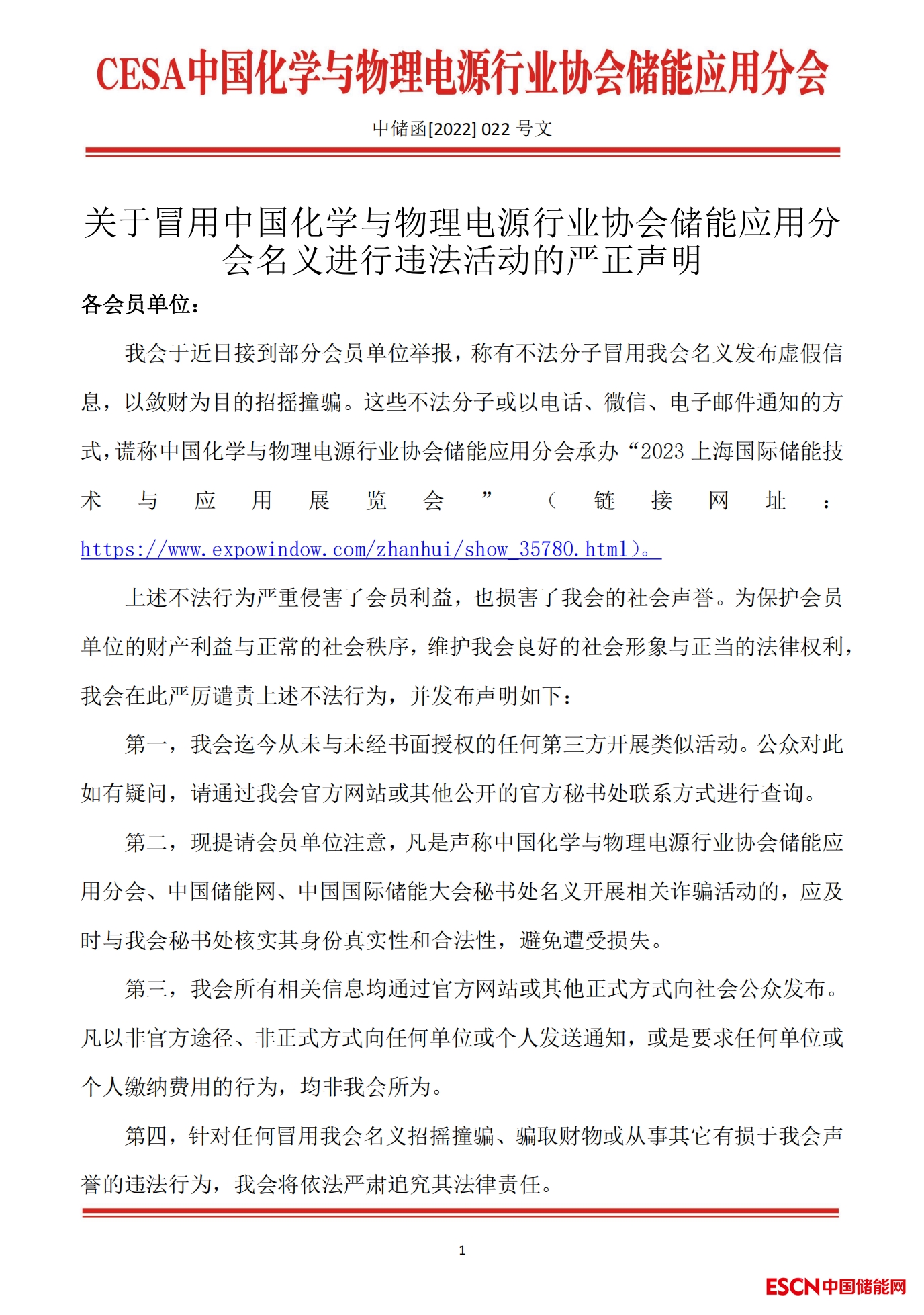 關(guān)于冒用中國(guó)化學(xué)與物理電源行業(yè)協(xié)會(huì)儲(chǔ)能應(yīng)用分會(huì)名義進(jìn)行違法活動(dòng)的嚴(yán)正聲明