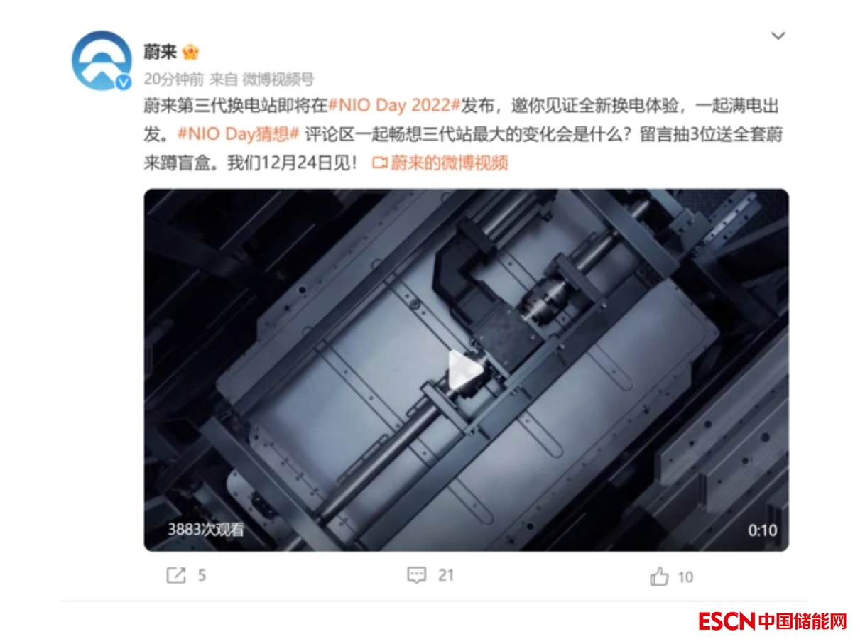 蔚來(lái)官宣第三代換電站12月24日發(fā)布