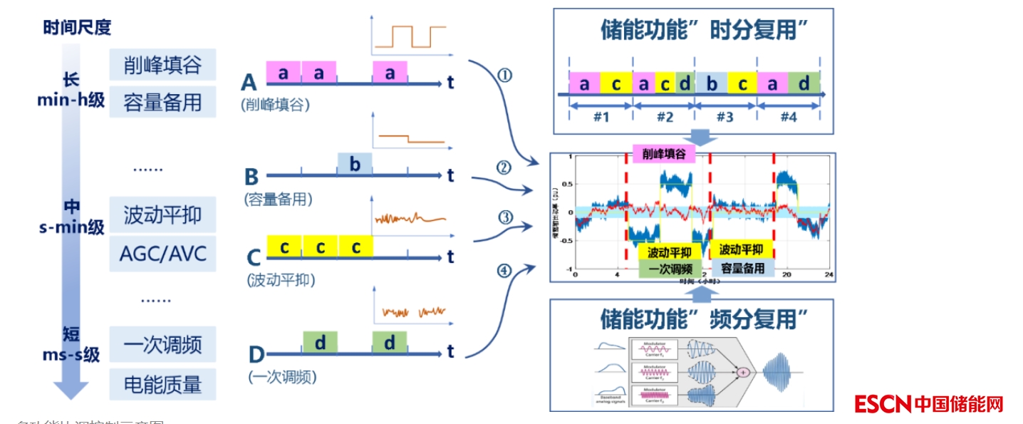儲(chǔ)能電站作為優(yōu)秀的靈活性調(diào)控資源,喚醒其閑置時(shí)段的應(yīng)用潛力尤為重要。研究團(tuán)隊(duì)一方面通過(guò)綜合考慮儲(chǔ)能電站的最大充放電功率、剩余容量、最大持續(xù)時(shí)間等因素,將儲(chǔ)能的功率和容量分配給不同的功能需求,實(shí)現(xiàn)儲(chǔ)能功率容量的最大化利用。另一方面,從時(shí)域和頻域兩個(gè)維度考量,根據(jù)不同功能需求響應(yīng)時(shí)間(毫秒級(jí)、秒級(jí)、分鐘級(jí)、小時(shí)級(jí)),確定協(xié)調(diào)控制方法,“見(jiàn)縫插針”式調(diào)動(dòng)儲(chǔ)能利用潛力。