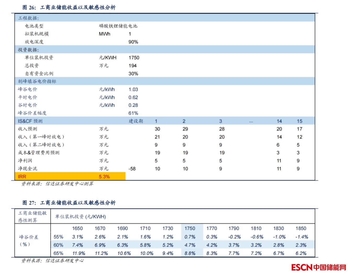 工商業(yè)儲能對峰谷價差的敏感性極高,擴大峰谷價差可以有效刺激工商業(yè)儲能積極性。我們測算了工商業(yè)儲能對單位裝機投資和峰谷價差的敏感性,得到其他條件不變的情況下,1)單位裝機成本下降 0.02 元/Wh,IRR提升約0.5pct;2)峰谷價差提升 5pct,IRR 提升約4.1pct。峰谷價差的提升對工商業(yè)儲能的經濟性提升非常顯著。峰谷價差由各省份分時電價政策決定,因此工商業(yè)儲能的建設積極性與政策導向相關度高,我們認為隨著各省分時電價機制的完善(比如尖峰電價的實行),峰谷價差的拉大,工商業(yè)儲能有望快速增長。