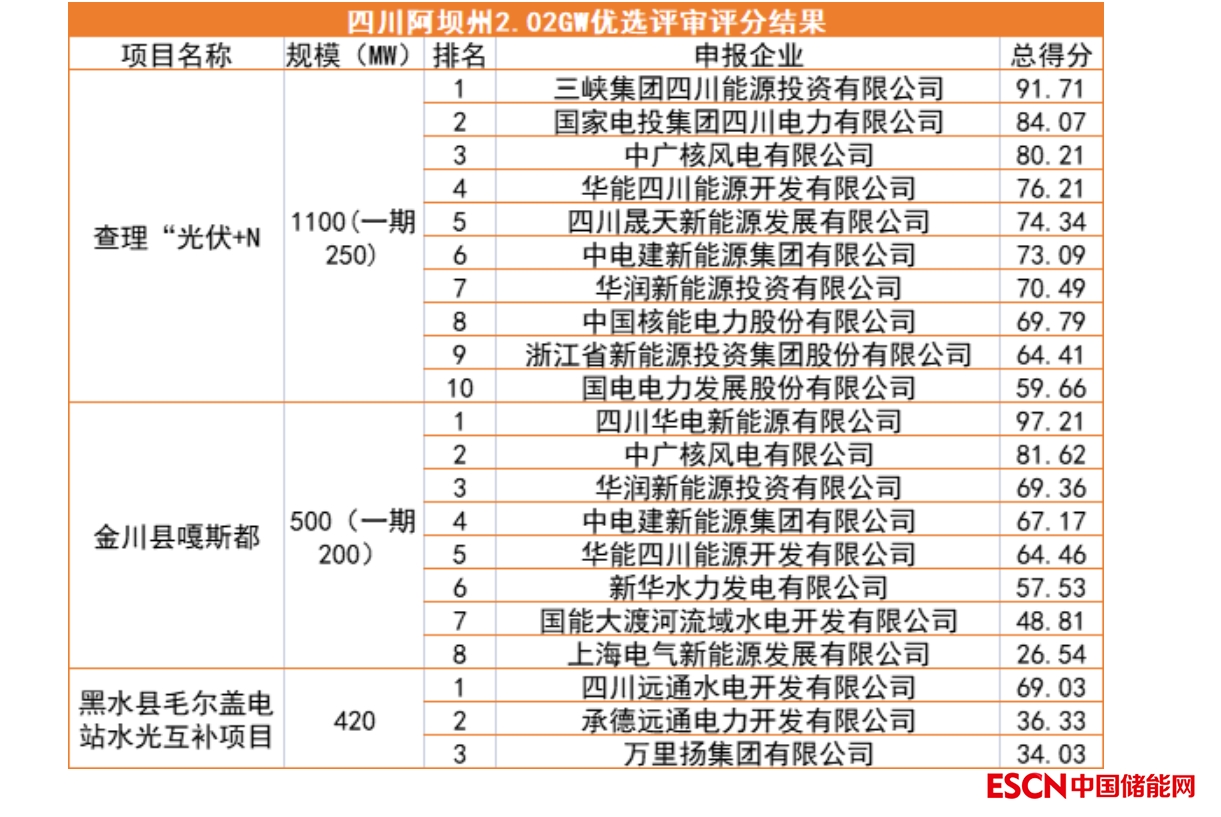 中國(guó)儲(chǔ)能網(wǎng)訊:近日,四川阿壩州公共資源交易網(wǎng)發(fā)布阿壩縣查理“光伏+N”、金川縣嘎斯都“光伏+N”以及黑水縣毛爾蓋電站水光互補(bǔ)項(xiàng)目競(jìng)爭(zhēng)優(yōu)選結(jié)果。共計(jì)17家企業(yè)參與投標(biāo),預(yù)計(jì)三峽、華電、四川遠(yuǎn)通水電擬中標(biāo)。