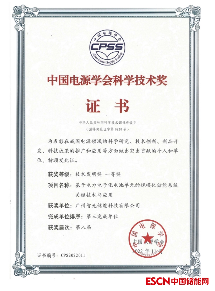 2、2022年11月,智光儲(chǔ)能參與的《基于電力電子化電池單元的規(guī)模化儲(chǔ)能系統(tǒng)關(guān)鍵技術(shù)與應(yīng)用》獲得第八屆中國(guó)電源學(xué)會(huì)科學(xué)技術(shù)一等獎(jiǎng)。