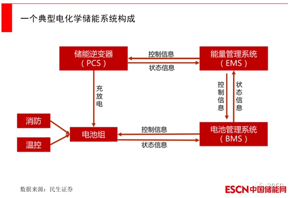 一套典型的儲(chǔ)能電池系統(tǒng),主要包括了電池、PCS變流器、BMS 電池管理系統(tǒng)、EMS溫控系統(tǒng)等核心環(huán)節(jié)。