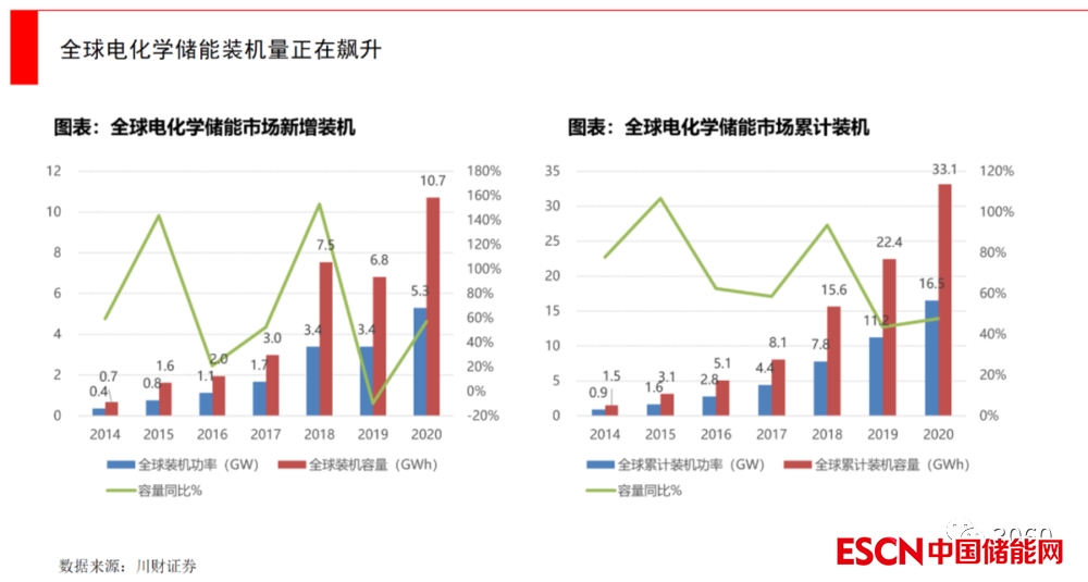 在中國(guó)碳中和的大目標(biāo)下,國(guó)家能源局給出了快速提升光伏、風(fēng)電等清潔能源的計(jì)劃,這就要求大規(guī)模、系統(tǒng)性的儲(chǔ)能配套。目前全球最多的傳統(tǒng)儲(chǔ)能手段就是抽水蓄能,而在新型儲(chǔ)能里,電化學(xué)儲(chǔ)能增速驚人。