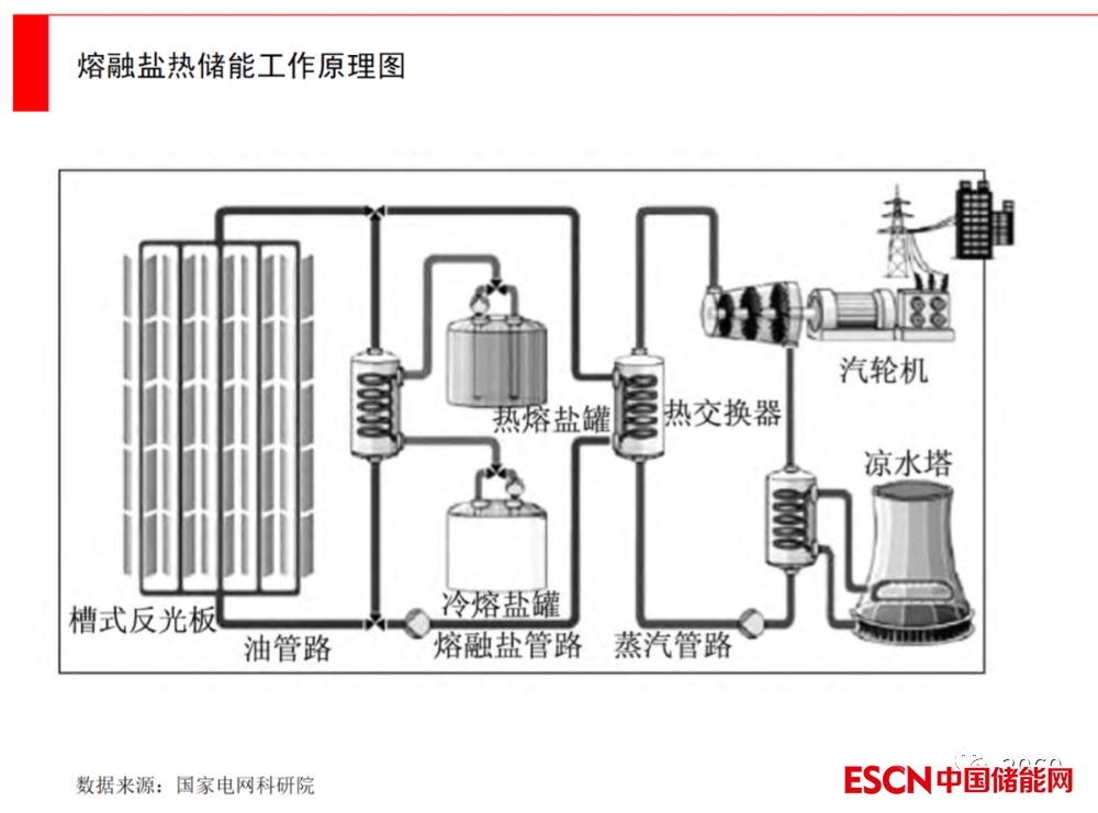 熔融鹽儲(chǔ)能:目前占比還很小。熔融鹽是將鹽升溫到熔點(diǎn)之后,形成的一種熔融態(tài)液體,基本都是由無(wú)機(jī)鹽構(gòu)成的熔融體。工作原理是將多余電能,把熔鹽的溫度增至500 ℃,再存貯至高溫熔鹽罐中,到用電高峰再把高溫熔鹽從罐內(nèi)取出,在熔鹽換熱器內(nèi)實(shí)現(xiàn)熱量轉(zhuǎn)換來(lái)對(duì)水與空氣進(jìn)行加熱,釋放熱能進(jìn)行使用。與過(guò)去的高溫導(dǎo)熱介質(zhì)相比,熔融鹽的高溫穩(wěn)定性比較好。這種方式主要用于冬季供暖。
