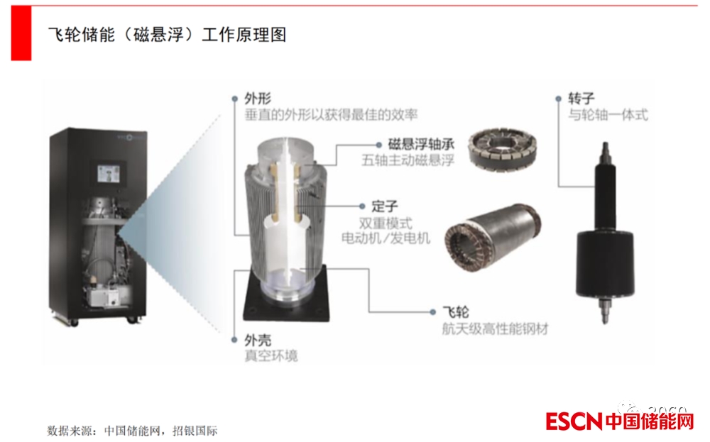 飛輪儲(chǔ)能:目前是一個(gè)研究重點(diǎn),但應(yīng)用場(chǎng)景較小。飛輪儲(chǔ)能是通過(guò)低摩擦環(huán)境中,高速旋轉(zhuǎn)的轉(zhuǎn)子來(lái)存儲(chǔ)動(dòng)能。在“充電”時(shí),電動(dòng)機(jī)會(huì)發(fā)動(dòng)將飛輪加速,將電能轉(zhuǎn)化為機(jī)械能儲(chǔ)存;當(dāng)需要用電時(shí),飛輪轉(zhuǎn)速下降,透過(guò)發(fā)電機(jī)將機(jī)械能轉(zhuǎn)化為電能給外部供電。整個(gè)飛輪儲(chǔ)存裝置是在封閉殼體中,一般是通過(guò)磁懸浮技術(shù)或真空環(huán)境,以減少阻力,保護(hù)轉(zhuǎn)子系統(tǒng)高速運(yùn)轉(zhuǎn)。飛輪儲(chǔ)能的優(yōu)點(diǎn)是能量轉(zhuǎn)換效率高(高達(dá)90%),響應(yīng)速度快(適合于電網(wǎng)調(diào)頻場(chǎng)景),但缺點(diǎn)也非常明顯,可容納電量比較少,并且造價(jià)很高,還面臨很多技術(shù)性難題,比如怎么設(shè)計(jì)高強(qiáng)度飛輪轉(zhuǎn)子?如何設(shè)計(jì)制造復(fù)合軸承?真空狀態(tài)下的電機(jī)及軸承如何高效冷卻?……