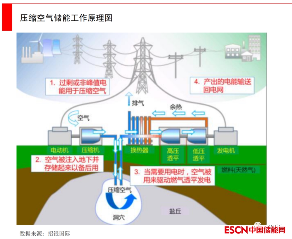 壓縮空氣儲(chǔ)能:目前體量還非常小,它的工作邏輯是在用電低谷期,把過(guò)剩電能將空氣壓縮至高壓,存到儲(chǔ)氣室中,也就是將電能轉(zhuǎn)化為空氣內(nèi)能儲(chǔ)存起來(lái)。當(dāng)需要用電時(shí),高壓空氣從儲(chǔ)氣室釋放進(jìn)入燃燒室,利用燃料燃燒加熱升溫后,驅(qū)動(dòng)燃?xì)馔钙桨l(fā)電。在實(shí)際應(yīng)用中,為了節(jié)約儲(chǔ)氣室的建設(shè)成本,經(jīng)常是去尋找礦洞來(lái)作為天然的儲(chǔ)氣室,這也會(huì)受制于地理結(jié)構(gòu)。壓縮空氣的能效比較低,只有65-75%。截至2021年底,壓縮空氣儲(chǔ)能在全球新型儲(chǔ)能裝機(jī)規(guī)模中,占比為2.3%,商業(yè)推廣目前比較少。
