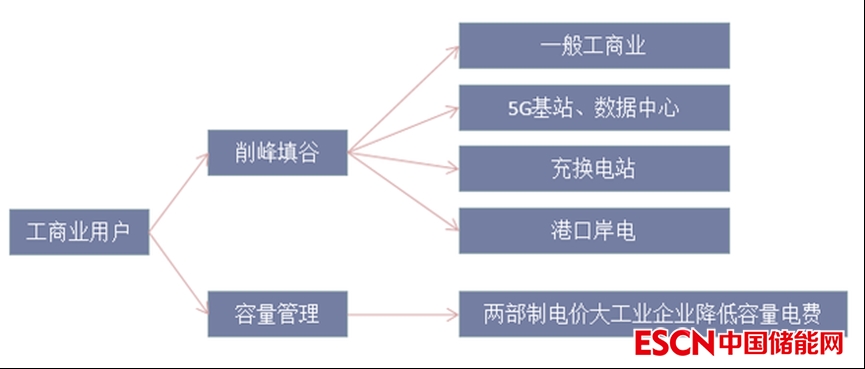 對于商業(yè)樓宇、醫(yī)院、學(xué)校等不適用于安裝大規(guī)模光伏自發(fā)電的場景,則通過安裝儲(chǔ)能系統(tǒng)達(dá)到削峰填谷、降低容量電價(jià)的目的。