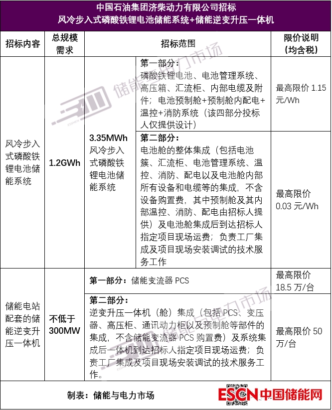 中國(guó)石油集團(tuán)濟(jì)柴動(dòng)力有限公司3.35MWh風(fēng)冷步入式磷酸鐵鋰電池儲(chǔ)能系統(tǒng)招標(biāo)公告