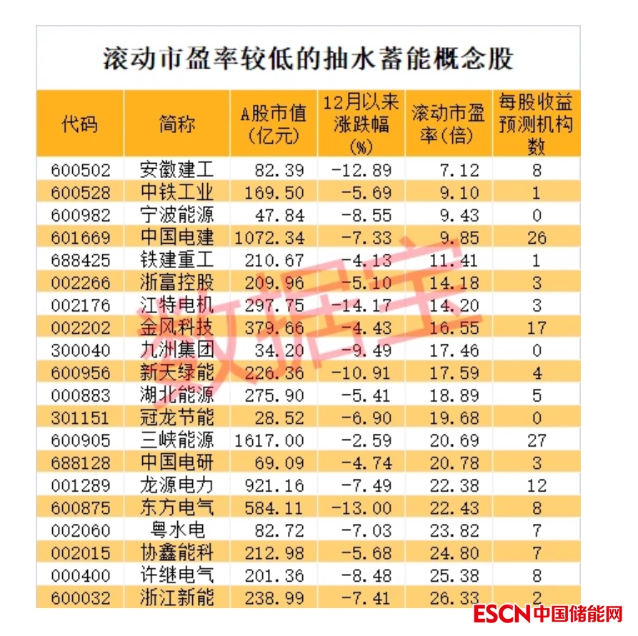 證券時(shí)報(bào)·數(shù)據(jù)寶統(tǒng)計(jì),截至12月30日收盤,12只抽水蓄能概念股滾動(dòng)市盈率低于20倍。安徽建工、中鐵工業(yè)、寧波能源、中國電建等4股滾動(dòng)市盈率不足10倍。