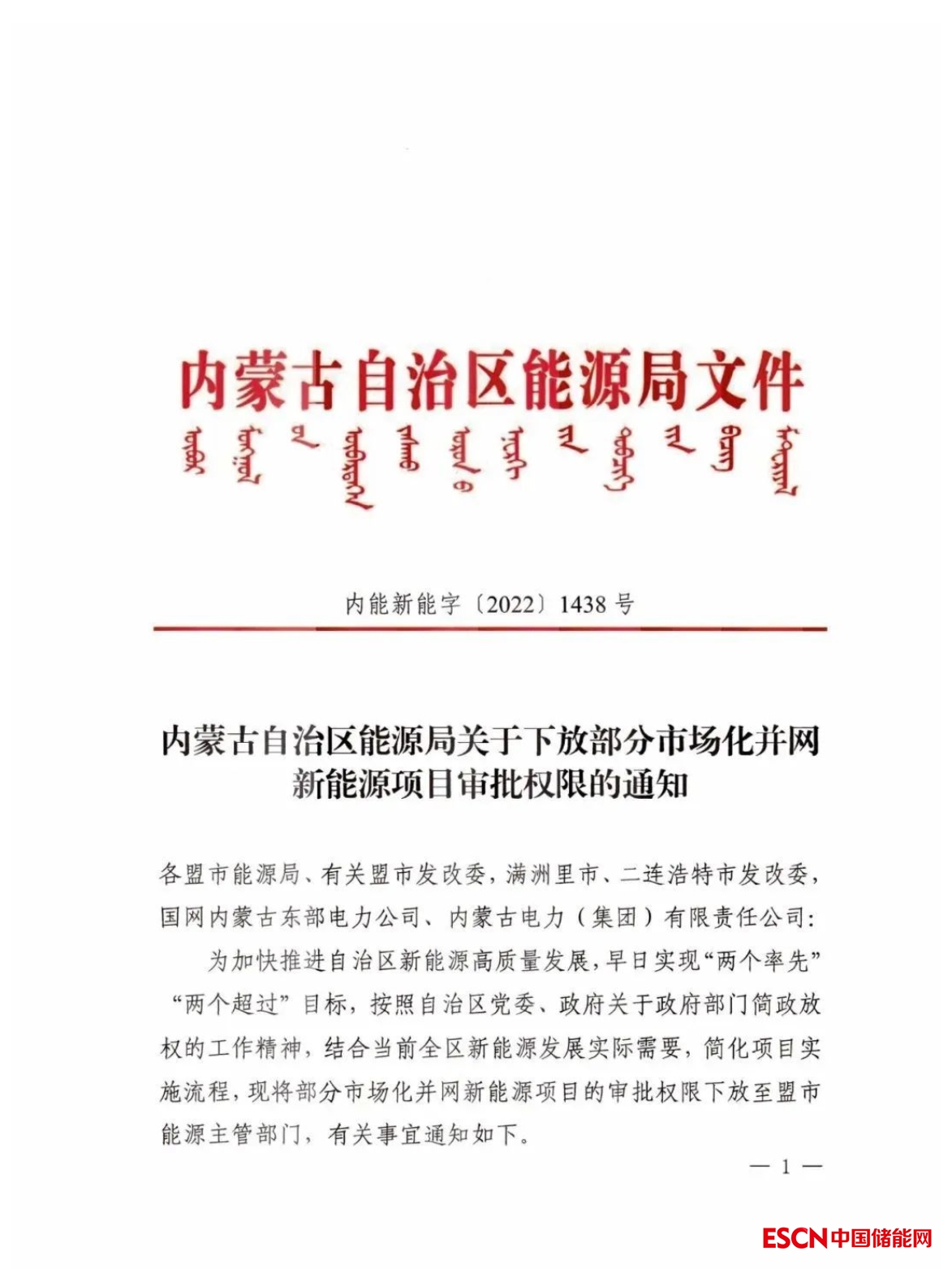 中國儲能網(wǎng)訊:12月29日,內(nèi)蒙古自治區(qū)能源局發(fā)布了《內(nèi)蒙古自治區(qū)能源局關(guān)于下放部分市場化并網(wǎng)新能源項目審批權(quán)限的通知》,將部分市場化并網(wǎng)新能源項目的審批權(quán)限下發(fā)至盟市能源主管部門。