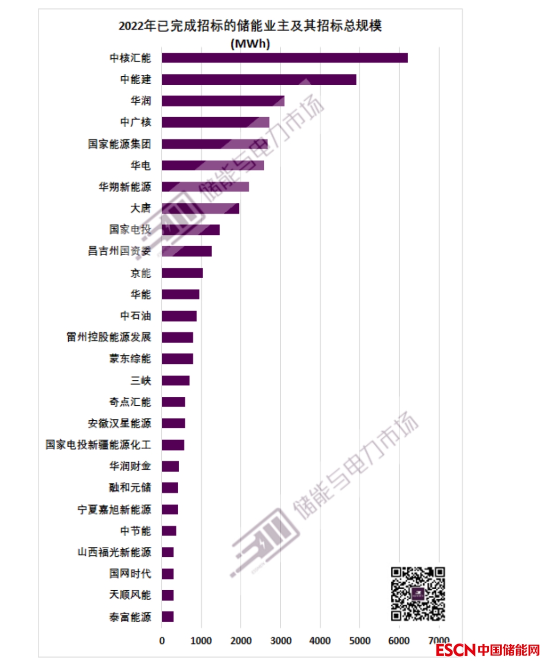 中核匯能、中能建、中廣核、華電、大唐等企業(yè)由于在2022年先后完成了GWh級的集采工作而名列前茅;