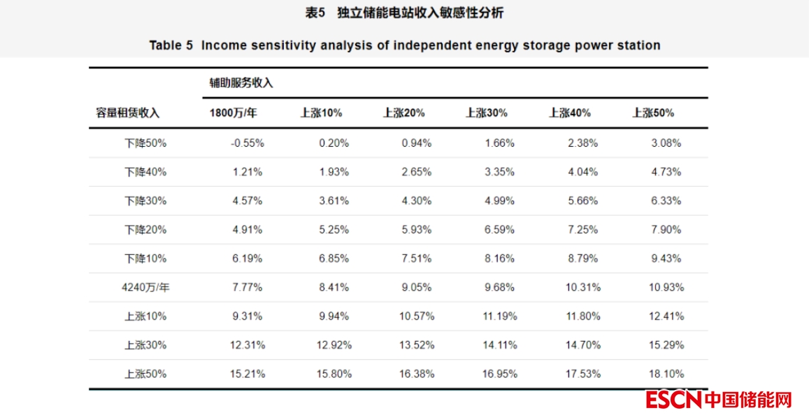 按照總投資為3.9億元的100 MW/200 MWh獨立儲能電站,根據(jù)上述主要參數(shù)進行測算(中性估計),項目可以達到7.77%的全投資收益率。同時,本文對于兩類收入變動對于獨立儲能電站項目內(nèi)部收益率影響的敏感性分析情況見表5。