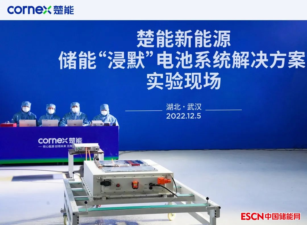 2022年12月5日,楚能新能源在儲能行業(yè)首創(chuàng)“浸默”電池安全系統(tǒng)發(fā)布,并在武漢江夏基地進(jìn)行該系統(tǒng)安全性能實(shí)驗(yàn)。