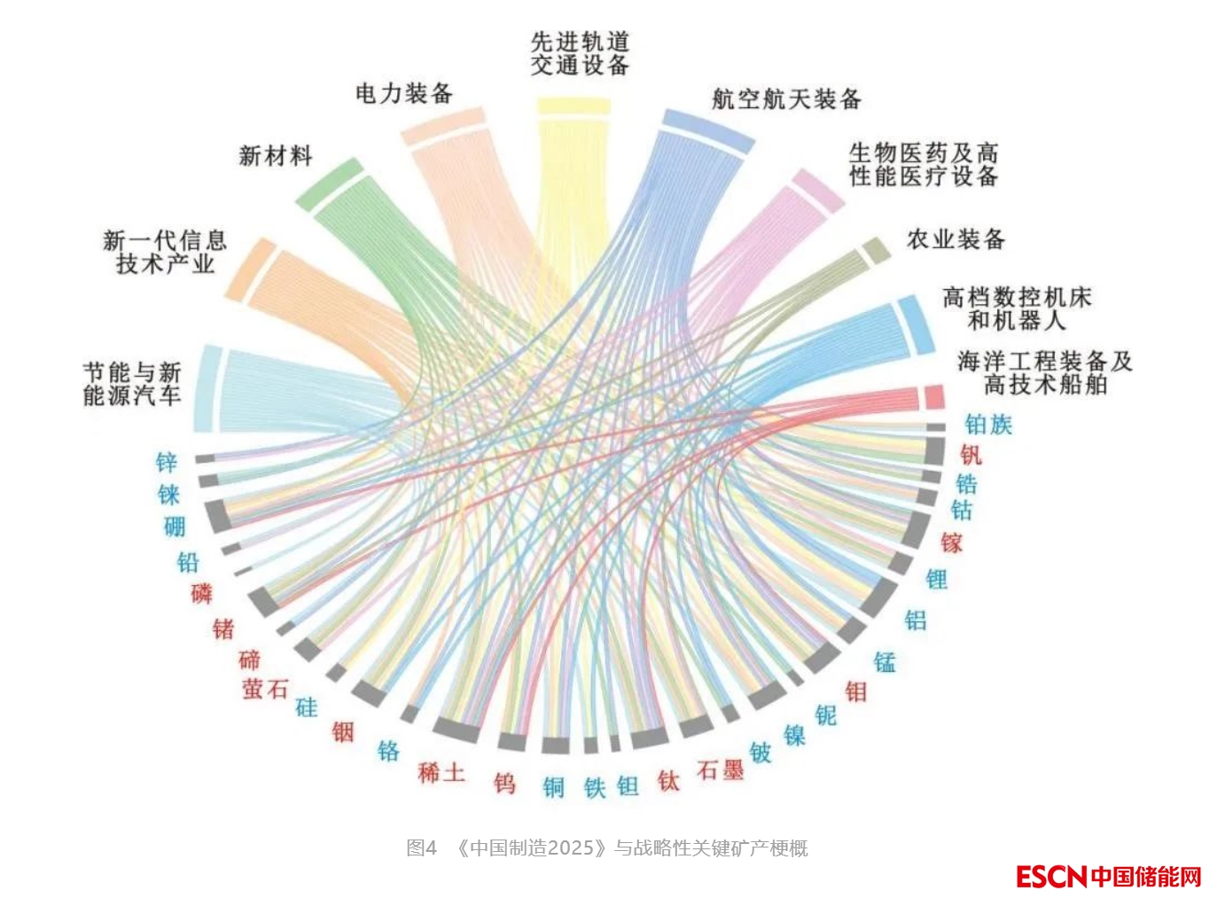 當前,我國正處于與發(fā)達經(jīng)濟體20世紀70年代中期伴隨工業(yè)化結(jié)束,產(chǎn)業(yè)升級、轉(zhuǎn)型的關鍵礦產(chǎn)需求快速增長相似的發(fā)展時期,同時疊加了21世紀以來新能源、信息技術、航天航空等戰(zhàn)略新興產(chǎn)業(yè)迅速發(fā)展對關鍵礦產(chǎn)種類和數(shù)量的依賴性需求。顯然,我國戰(zhàn)略性關鍵礦產(chǎn)大量快速消費將不可避免。以《中國制造2025》為例,我國已經(jīng)投入超過30種戰(zhàn)略性關鍵礦產(chǎn)支撐這一計劃的實施(圖4)——如果把鉑族和鑭系稀土元素展開,我國戰(zhàn)略性關鍵礦產(chǎn)超過50種。戰(zhàn)略性關鍵礦產(chǎn)關系到我國龐大產(chǎn)業(yè)鏈的安全和國計民生大計,需要予以高度關注。