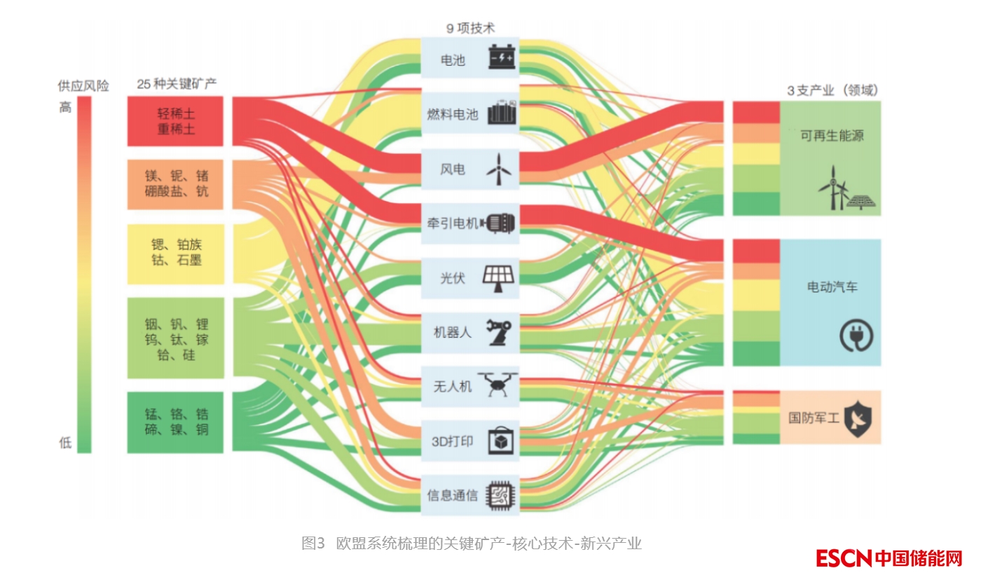 戰(zhàn)略性關鍵礦產(chǎn)種類和數(shù)量爆發(fā)式增長彰顯了21世紀以來航天航空、信息技術、人工智能、新能源、生物制藥等戰(zhàn)略新興產(chǎn)業(yè)高速發(fā)展,以及數(shù)字經(jīng)濟和高端制造對礦產(chǎn)資源提出的新需求。關鍵礦產(chǎn)內(nèi)涵正在進一步延伸,某些戰(zhàn)略性關鍵礦產(chǎn)也被稱之為“高新技術礦產(chǎn)”“清潔能源礦產(chǎn)”或“數(shù)字經(jīng)濟礦產(chǎn)”等。歐盟系統(tǒng)梳理了自身3支重要產(chǎn)業(yè)(領域)、9項核心技術和超過25種(類)關鍵礦產(chǎn)物質(zhì)流動關系和供應風險(圖3),將核心技術與關鍵礦產(chǎn)有機關聯(lián)值得高度關注。