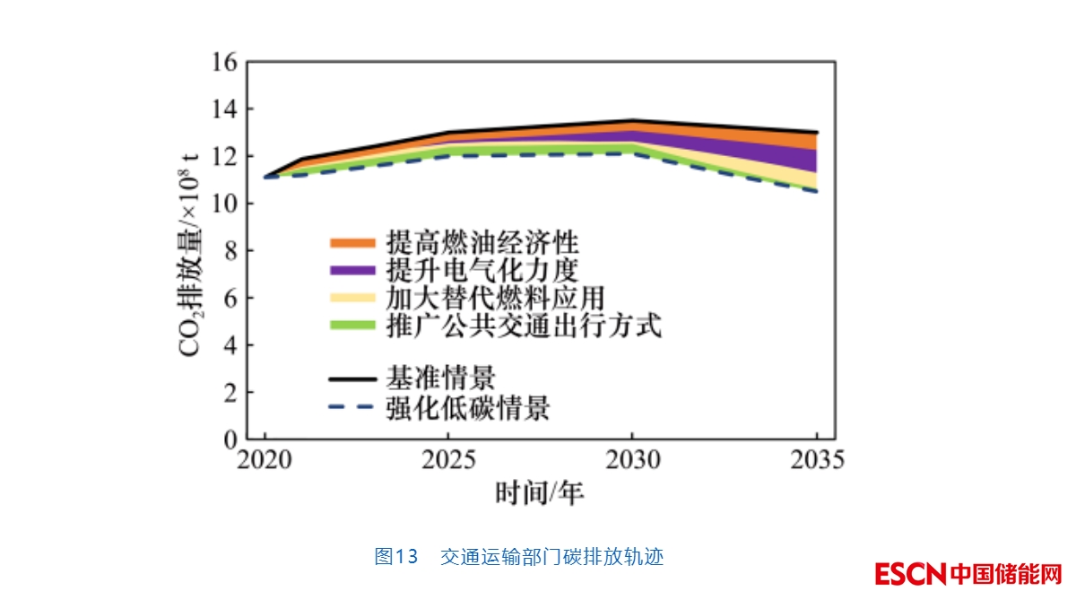 交通運(yùn)輸部門(mén)是化石能源消耗和CO2排放增長(zhǎng)最快的領(lǐng)域之一。降低交通運(yùn)輸部門(mén)碳排放的主要技術(shù)措施包括:通過(guò)能效提升提高各類交通運(yùn)輸工具的燃油經(jīng)濟(jì)性,降低各類運(yùn)輸工具的運(yùn)行能耗;加大交通運(yùn)輸工具的電氣化程度,擴(kuò)大電動(dòng)車和混合動(dòng)力的應(yīng)用規(guī)模和范圍;發(fā)展燃料乙醇、生物柴油、燃料電池、可再生能源制氫及可再生合成燃料等替代技術(shù),加大替代燃料的應(yīng)用;大力發(fā)展公共交通,推廣公共出行方式(見(jiàn)圖13)。2025年前,提高燃油經(jīng)濟(jì)性、推廣公共交通是交通部門(mén)脫碳的主要路徑;2030年左右,提升電氣化力度將促進(jìn)交通部門(mén)進(jìn)一步脫碳;2035年新能源汽車保有量占乘用車比例將超過(guò)25%,電力占交通能源消費(fèi)總量比例將超過(guò)22%。隨著合成替代燃料技術(shù)的成熟以及以新能源為主體的電力系統(tǒng)逐步建成,2035年后可再生燃料替代將在交通運(yùn)輸領(lǐng)域減碳上發(fā)揮關(guān)鍵作用。此外,交通運(yùn)輸部門(mén)還需進(jìn)一步通過(guò)加快大宗貨物和中長(zhǎng)距離貨物運(yùn)輸?shù)摹肮D(zhuǎn)鐵”“公轉(zhuǎn)水”等方式優(yōu)化運(yùn)輸結(jié)構(gòu),加快發(fā)展智慧交通,提高運(yùn)輸組織效率。