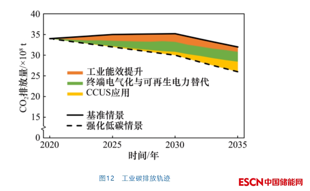工業(yè)是僅次于能源電力部門(mén)的第二大CO2排放部門(mén)?;鶞?zhǔn)情景下工業(yè)部門(mén)的CO2排放先緩慢增長(zhǎng)再下降,強(qiáng)化低碳情景下工業(yè)部門(mén)的CO2排放下降速度加快(見(jiàn)圖12)。工業(yè)領(lǐng)域能效的大幅提升、風(fēng)光清潔能源的應(yīng)用以及CCUS的規(guī)?;瘧?yīng)用將是工業(yè)碳排放降低的關(guān)鍵舉措。工業(yè)用能大約在2030年前后達(dá)峰,隨后進(jìn)入峰值平臺(tái)期。隨著工業(yè)行業(yè)終端電氣化水平的不斷提升,工業(yè)用能中電的比例逐步提高,預(yù)計(jì)2035年工業(yè)領(lǐng)域電能占比提高到37%以上;有研究指出2035年工業(yè)部門(mén)電氣化水平甚至可以達(dá)到40%以上。工業(yè)用固體燃料在2030年左右達(dá)峰并趨于穩(wěn)定,2035年煤等固體燃料占比約為43%、天然氣占比在8%以上。由于鋼鐵、有色、水泥、建材、化工等行業(yè)存在難以避免的碳排放,迫切需要加快CCUS技術(shù)的研發(fā)與部署,從而推動(dòng)工業(yè)領(lǐng)域的碳減排。2030年后需要逐步開(kāi)展CCUS技術(shù)的應(yīng)用,進(jìn)一步加快CCUS技術(shù)的滲透率。