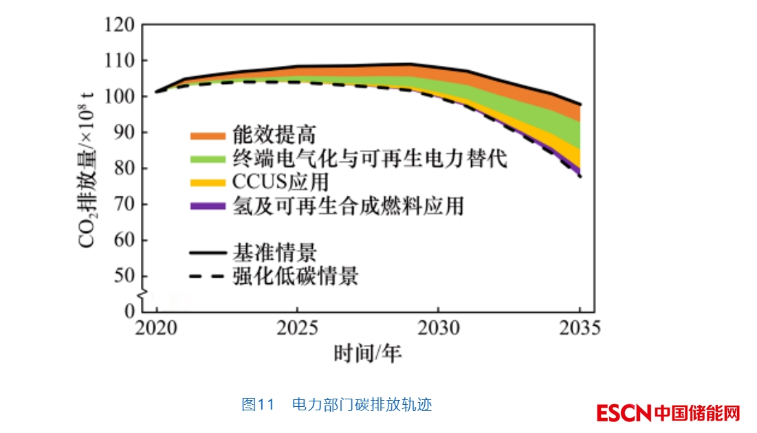電力低碳轉(zhuǎn)型對(duì)“雙碳”目標(biāo)的實(shí)現(xiàn)具有全局性意義??紤]不同外部因素的作用大小,預(yù)計(jì)2035年全社會(huì)用電量將從2021年的8.31×1012 kW·h提高到9.8×1012 kW·h(基準(zhǔn)情景)~1.22×1013 kW·h(強(qiáng)化低碳情景)。這主要?dú)w因于電氣化的快速發(fā)展,包括電力替代煤炭、石油等化石能源直接燃燒和利用,或以可再生電力等制氫,以及終端部門(mén)電氣化的強(qiáng)化等。電源結(jié)構(gòu)整體呈現(xiàn)清潔化發(fā)展的態(tài)勢(shì),煤電裝機(jī)量和發(fā)電量占比不斷下降,非化石能源裝機(jī)和發(fā)電量的占比穩(wěn)步提升。電源總裝機(jī)從2020年的2.2×109 kW增加至2035年的3.6×109 kW,增加了64.0%。煤電裝機(jī)總量下降至1×109 kW以下,相較2020年下降9.6%。氣電裝機(jī)總量超過(guò)2×108 kW,相較2020年增加122.5%??稍偕娏ρb機(jī)合計(jì)超過(guò)2.1×109 kW,是2020年的2.4倍。發(fā)電總量從2020年的7.6×1012 kW·h提高至1.27×1013 kW·h,增加了66.3%。其中,來(lái)自風(fēng)能、太陽(yáng)能的可再生電力發(fā)電量增加了近5倍,氣電發(fā)電量增加了1.9倍,核電發(fā)電量增加了2.4倍。從碳排放來(lái)看,電力系統(tǒng)碳排放預(yù)計(jì)在2025—2030年達(dá)峰,達(dá)峰后進(jìn)入短暫平臺(tái)期,然后開(kāi)始下降(見(jiàn)圖11)。電力系統(tǒng)的清潔化和低碳化將對(duì)全社會(huì)的碳排放下降帶來(lái)實(shí)質(zhì)性貢獻(xiàn)。