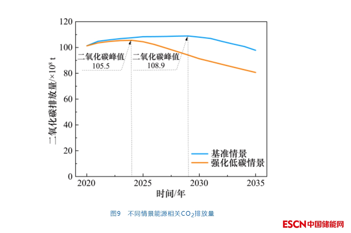 圖9所示為兩種情景下的CO2排放。基準(zhǔn)情景下能源相關(guān)CO2排放在2025年前會(huì)繼續(xù)增加,2029年左右達(dá)到峰值(約1.089×1010 t),2035年CO2排放降低至9.78×109 t。強(qiáng)化低碳情景下能源相關(guān)CO2排放在2025年前能實(shí)現(xiàn)達(dá)峰,峰值約1.055×1010 t,2035年能源相關(guān)CO2排放進(jìn)一步降低至8.06×109 t。CO2排放強(qiáng)度也將持續(xù)降低,2035年單位GDP CO2排放將降低至0.452 t CO2/萬(wàn)元到0.373 t CO2/萬(wàn)元。相較2005年,低碳情景下2030年單位GDP CO2排放將下降68.7%,2035年下降77.6%,強(qiáng)化低碳情景下2030年單位GDP CO2排放強(qiáng)度下降73.5%,2035年將下降81.5%。兩種情景均可實(shí)現(xiàn)2030年單位GDP CO2排放比2005年下降65%以上的目標(biāo)。